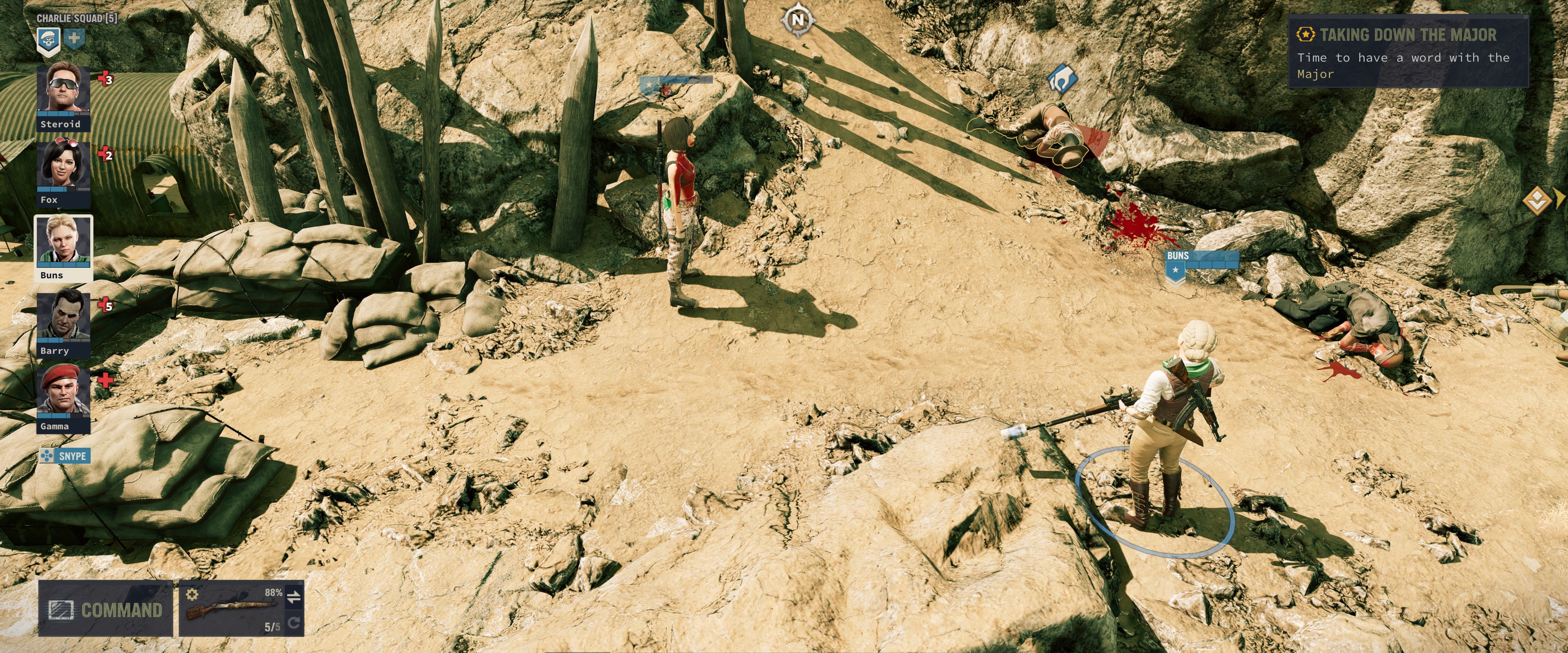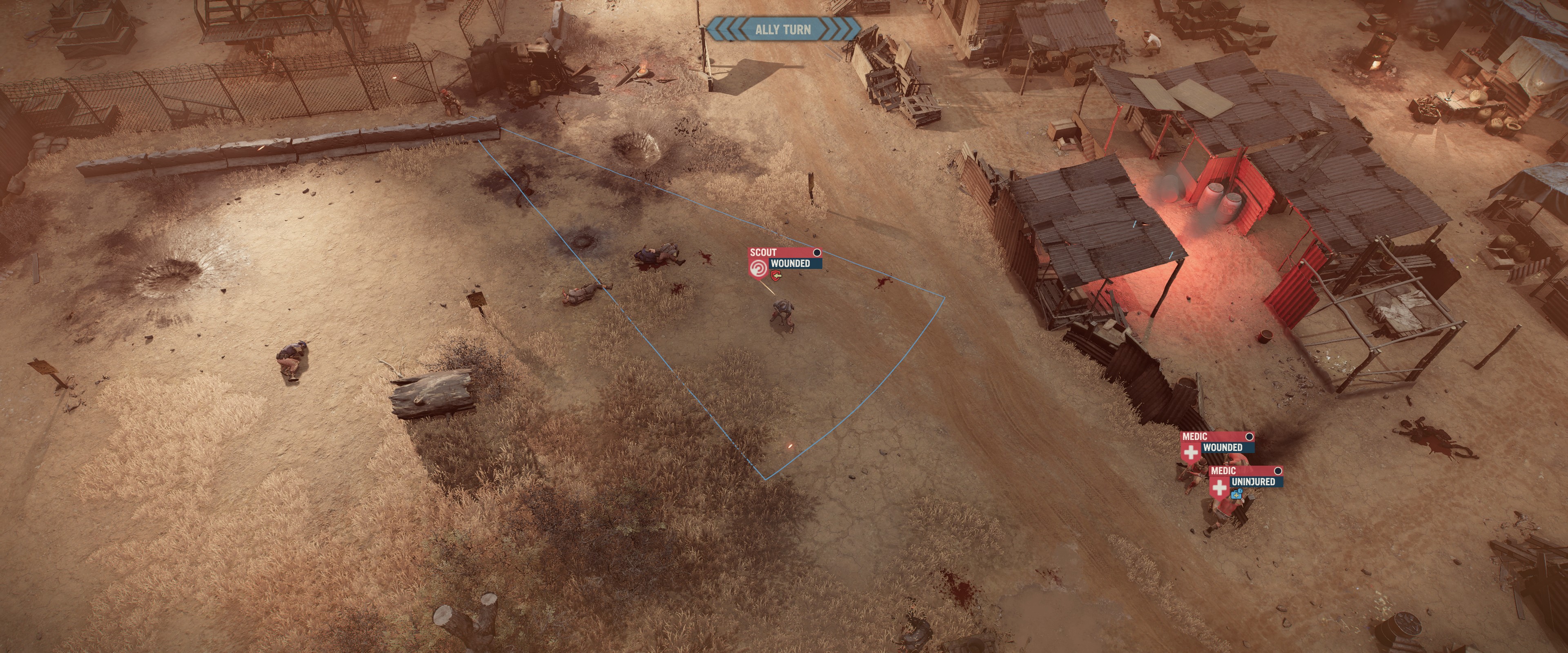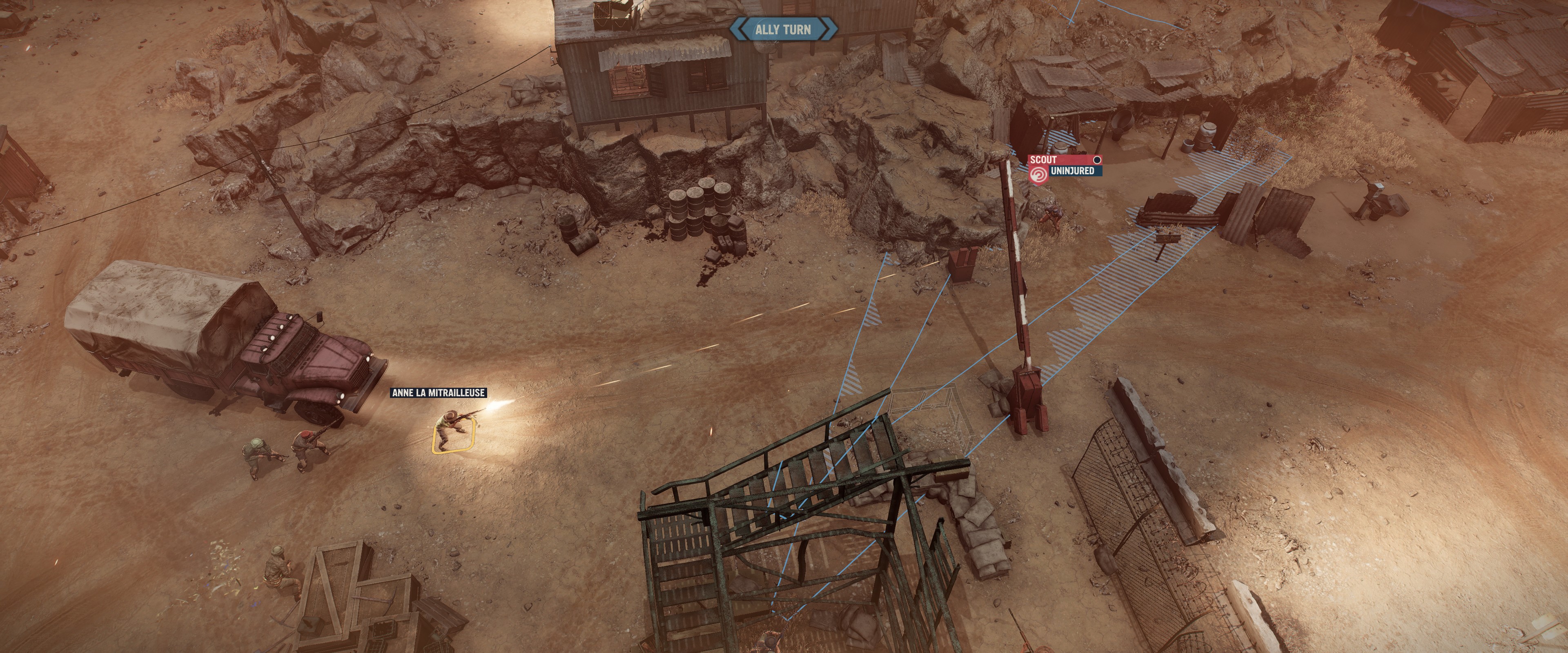 The encounters in tactical view start by deploying your squad in the entry area of the section, which is determined by available intel (intel can reveal alternative deployment areas or the location of enemies and vantage points) and the direction of your approach. Sometimes it is best to retreat and try attacking from another side if the scenery is not ideal from one direction.
